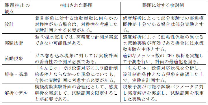 (2)で実施した個別分析の結果に基づき検証上の課題の抽出を行った。即ち、「もんじゅ」相当のFBRを現時点で初めて設計することを想定し、その設計手法の検証に必要となる模擬流動実験の検討方針を表−3のとおり抽出した。抽出の結果、「もんじゅ」流動設計手法検証では精密に実機状態を模擬した流動実験を行う必要があったが、現時点では流動解析技術の進歩やナトリウム流動挙動に対する知見の蓄積から、数値実験による感度解析を援用することが有効であること等が判った。