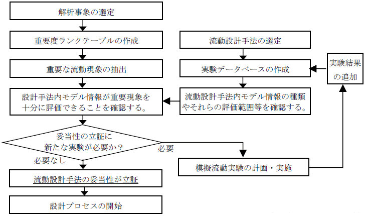 そこで、模擬流動実験の実施内容の適正化、即ち実験実施費用を適正に低減することを目的に、最新の妥当性立証手法に基づいて設計手法の検証を最小限かつ適正に行う方法を研究する。