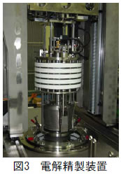 このうち、電解精製装置(図3)は、陰極析出物の掻き取りや電極の入れ替えといった電解以外の時間の短縮を図るべく陰極構造などを見直して設計したものである。約30リットルの溶融塩が入る低炭素鋼製容器を電解槽とし、中心に円柱状の陰極を、その外周の同心円上に陽極バスケットを配置した。この電解精製装置では、中心部の陰極にUが樹枝状の金属として析出・成長するが、定期的に陰極を回転させながら徐々に上方へ引き上げることにより、固定刃で析出Uを掻き落として下方の容器で回収することが特徴であり、これにより装置のコンパクト化と高速化を図っている。