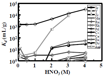 一例として、図-3にC6-BTP吸着剤による0.1〜4 M硝酸溶液からの241Am及び代表的なFP元素の吸着分配係数(Kd)と硝酸濃度との関係を示す。硝酸濃度の増加とともにAmの吸着性が著しく増大した。C6-BTPは酸性溶液中では解離しない中性分子であるため、Am(NO3) (R-BTP)nの錯体化合物形態で吸着されると推定される。希土類FPは主にLa〜Ndの軽ランタノイド(Ln)であるが、これらの元素は殆ど吸着しなかった。硝酸濃度とともに比較的重いLnはある程度の吸着性を示したが、2〜3 M硝酸中では双方の分離係数は100程度以上に達した。これはAmとの分離は容易であることを示唆している。一方、Pdは特異に高い吸着性を示し、吸着機構や分離法を別途検討する必要がある。また、いずれの吸着剤においても吸着速度及び純水による脱着速度は極めて遅かった。