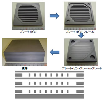 熱交換器の構造は、当初は板材に溝加工をしたものを積層して接着して構成していたが、最終的には図3に示すように、板材の間に流路を構成するピンをはめ込み、NITE法により接合することで製作する方法を開発した。また接合には図4に示す高粘度スラリーシートを用いる方法を開発した。温度履歴と接合部組織も図に示す。これらは歩留りが高く、実用規模装置にスケーリングの期待できる製造法である。