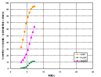 使用済燃料を用いた直接抽出試験をこれまで3回実施した。いずれの試験でもU、Pu、Am、Np、Ndが抽出されることは確認できたが,Puの回収率が低かった。Puの回収率の低下が顕著であった例を図3に示す。なお、溶解速度自体は未照射MOXに比べて速く、また、Csの除染係数は約300が得られている。