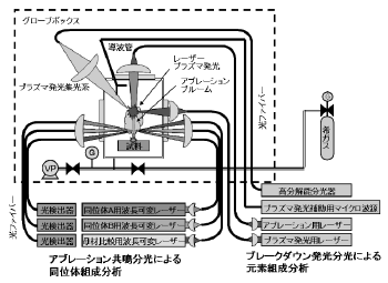 以上のような背景を踏まえ、本研究開発では、広範囲な元素分析が可能なレーザーブレークダウン発光分光法と同位体分析が可能なレーザーアブレーション共鳴吸収分光法とを、レーザーアブレーションという共通の素過程において機能的に組み合わせることで、核燃料物質中の組成、不純物分析と濃縮度評価を一連の操作で実施可能な手法として確立することに注目した。模擬FP、模擬MAを含有した未照射核燃料物質を対象として、核燃料物質をマトリックスとしたレーザー励起ブレークダウン発光分析法の最適化と、アブレーションにより生成される原子(イオン)雲に対するレーザー共鳴吸収法による濃縮度測定法の開発を主たる研究開発課題とし、次世代燃料の候補である「低除染TRU燃料」の遠隔直接分析に必要な技術基盤の形成を目指した。