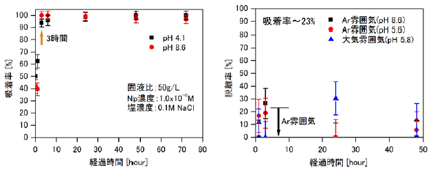 図4 Npのマグネタイトへの吸着率(左)とマグネタイトからの脱離率(右)の時間依存性